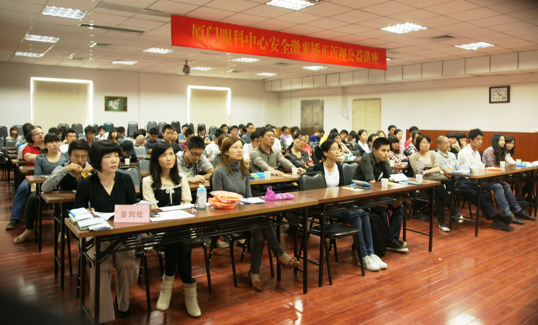第三期講座由視光科副主任醫(yī)師揭黎明開講,現(xiàn)場吸引了近百個(gè)近視患者前來參加。會上大家踴躍提問,對于最近頗受關(guān)注近視手術(shù)的是否有并發(fā)癥等問題揭主任都進(jìn)行了一一解答。很多人通過聽課并向?qū)<易稍兇蛳耸中g(shù)疑慮,聽眾當(dāng)中有近40%都報(bào)名確定了手術(shù)時(shí)間。