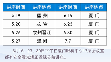 另外,為向廣大近視朋友普及近視防治的常識,廈門眼科中心定期舉辦近視矯治公益講座。具體時間安排如下: