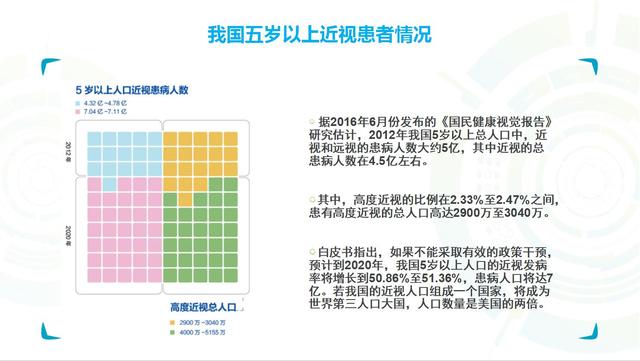 這個白皮書還告訴我們,如果不能夠及時采取有效的干預措施,到2020年的時候,我們國家5歲以上的人口近視發(fā)病率將進一步增長到51%或者還要多一點。那么這個人口就不再是5億了,就接近7個億。這個數(shù)字很嚇人,是美國現(xiàn)有人口的兩倍。