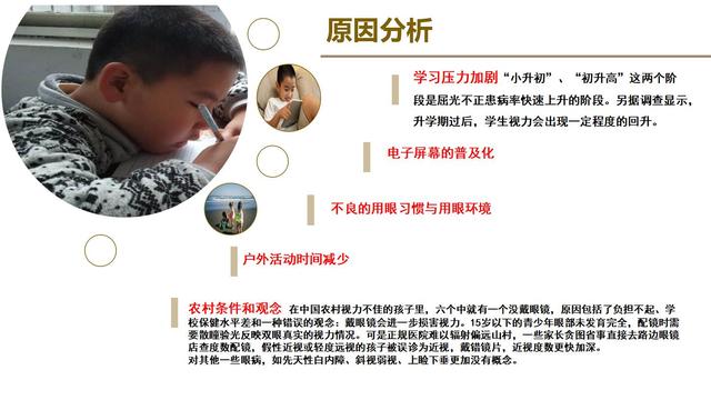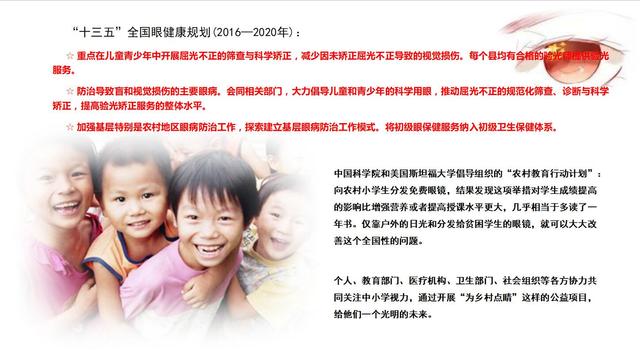 全國十三五健康規(guī)劃,其中包括眼健康規(guī)劃,在眼健康規(guī)劃的十幾條當中涉及到兒童有9條,這里提出來三條是我們應該關(guān)注的。