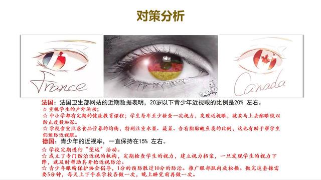 在法國,第一條就是重視戶外活動,然后中小學都減少他的課堂時間,然后要確定必須定期進行視力檢查。如果發(fā)現(xiàn)近視,要求立即配鏡,以減少加深度數(shù)。另外在膳食上不能挑食。