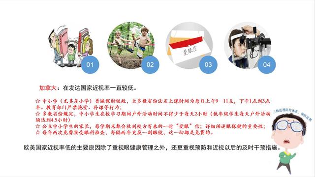 我們可以看到加拿大的近視率一直維持很低,中小學,尤其是小學課堂時間短,更多的時間讓孩子到戶外去,給孩子真正的童年。教育部門嚴禁拖堂,不允許拖堂時間,也不允許補課。在加拿大省份里都強調(diào)每天戶外活動時間不能少于兩小時。所以這三個國家都一致的強調(diào)每天增加戶外活動。