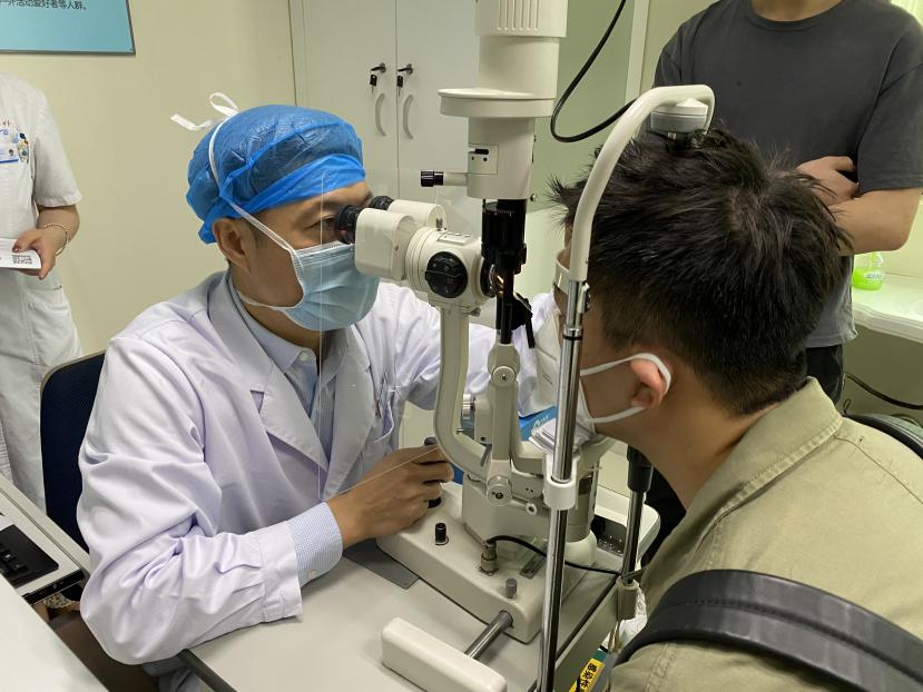 ▲廈門(mén)眼科中心屈光科執(zhí)行主任揭黎明為龍峰做術(shù)前檢查