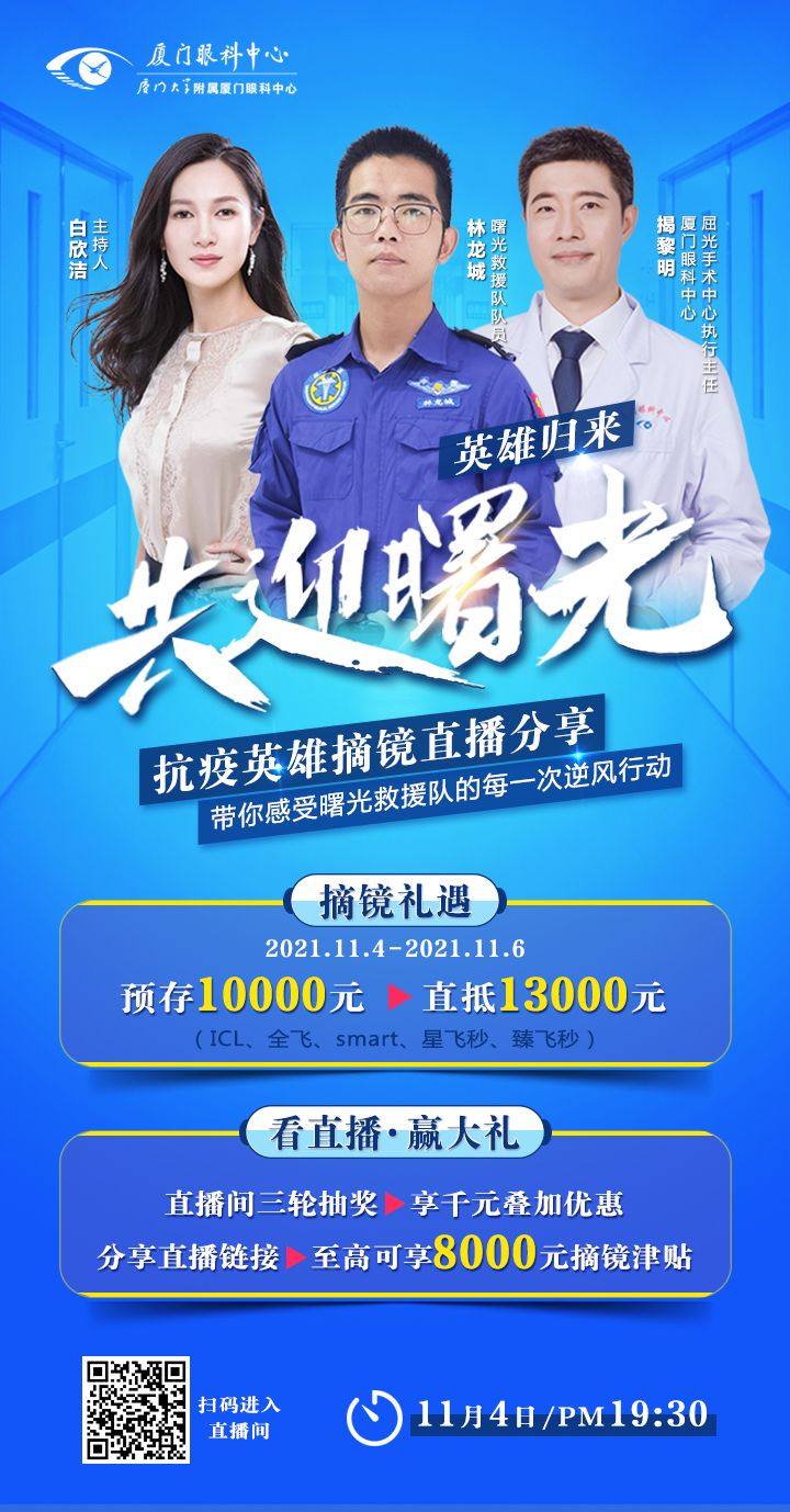 11月4日19:30,抗疫英雄、廈門眼科中心公益摘鏡體驗官——林龍城將通過直播分享他的曙光故事、抗疫經歷及摘鏡體驗,廈門眼科中心屈光手術中心執(zhí)行主任、主任醫(yī)師揭黎明將現(xiàn)場揭秘手術過程。