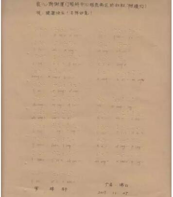 近日,廈門(mén)眼科中心眼底二病區(qū)的醫(yī)生護(hù)士們收到了一封特殊的感謝信。感謝信上每個(gè)醫(yī)生護(hù)士的名字,都是用盲文打出來(lái)的,下排還用鉛筆標(biāo)注了拼音,仔細(xì)拼讀才知道這是一列醫(yī)生名單:黎曉新、吳國(guó)基...