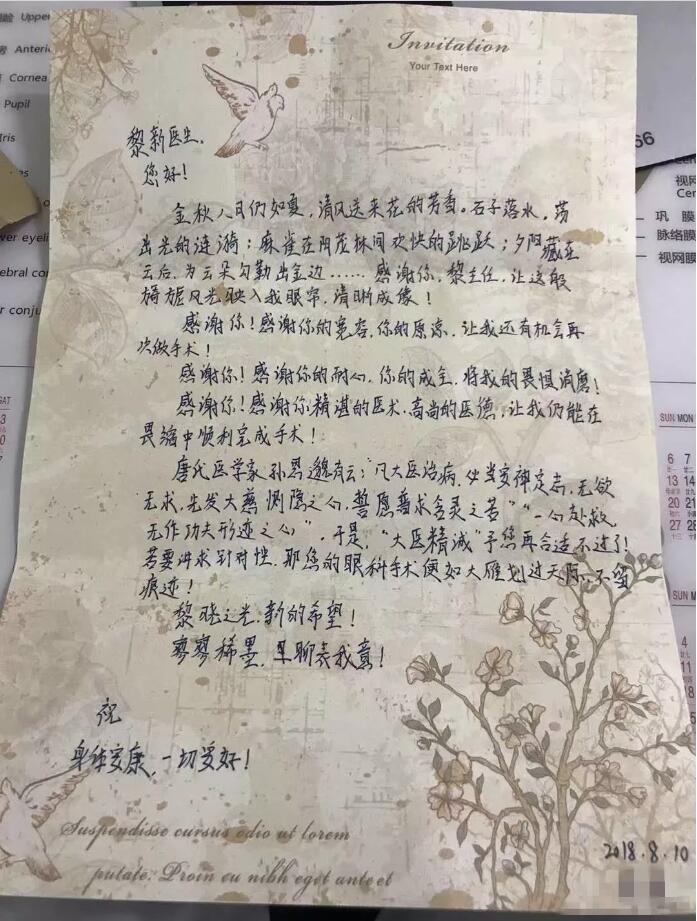 在感謝信里,她感謝黎新主任的“寬容和耐心”,讓她克服畏懼心理,她稱贊黎新主任的手術(shù)技術(shù)如“大雁劃過天際不留痕跡”,是“黎曉之光,新的希望”。