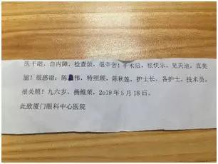 爺爺遞給廈門眼科中心白內(nèi)障科室陳偉主任及醫(yī)護(hù)人員的紙條