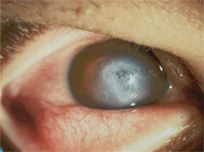 小森的右眼就是角膜變薄導致角膜內層結構破裂,角膜出現(xiàn)水腫,視力驟降,屬于急性圓錐角膜發(fā)作。商旭敏博士接診時,距離小森發(fā)病已過去了2天,他的右眼角膜已呈現(xiàn)肉眼可見的白色。