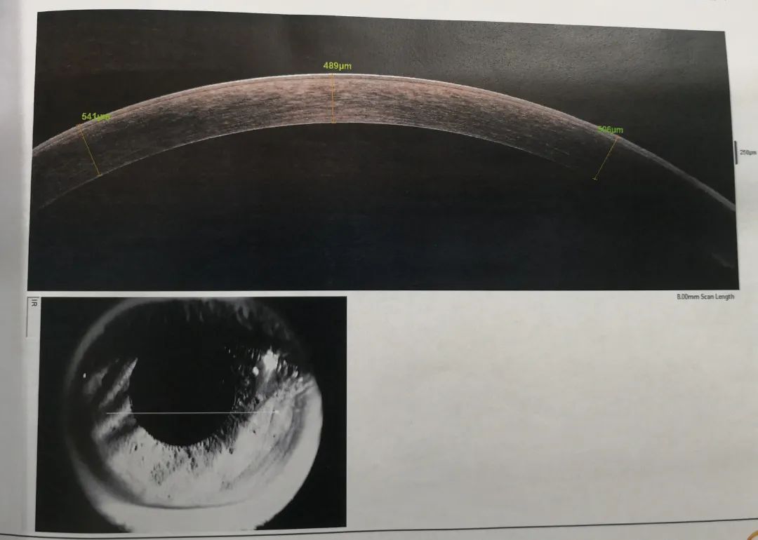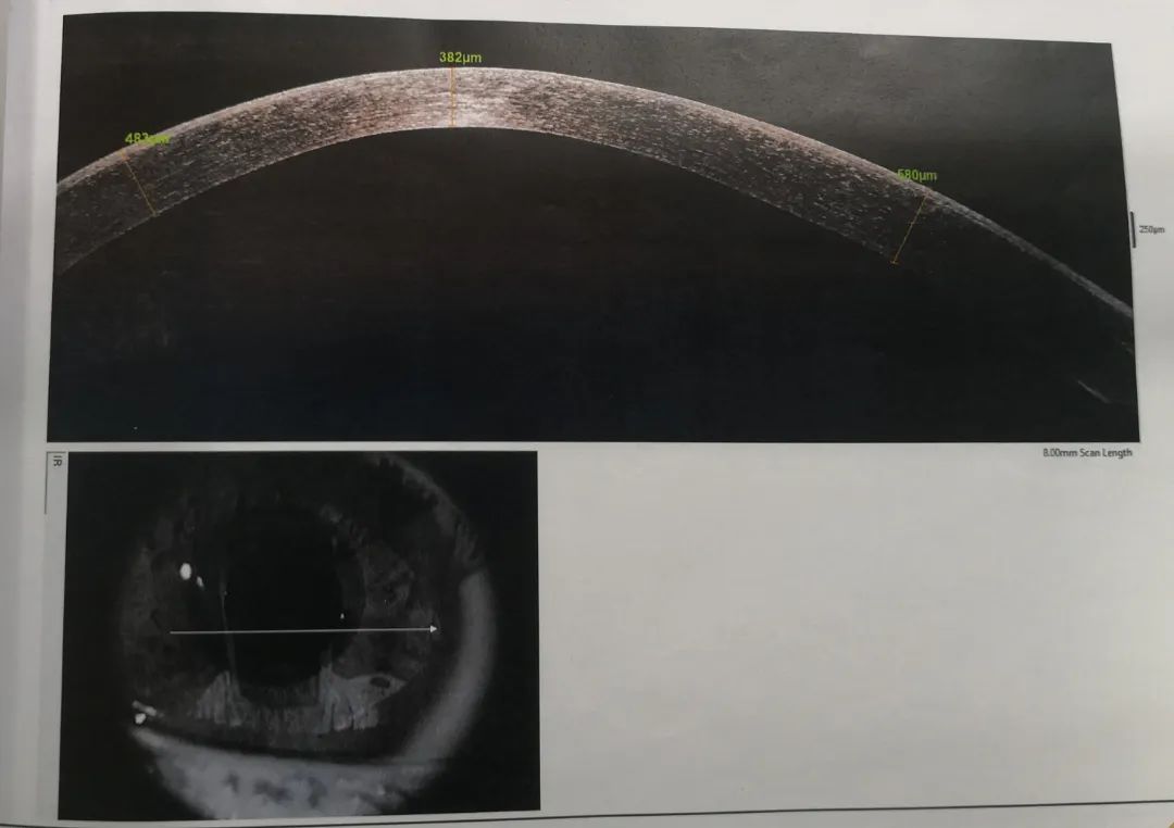小雨重新回憶起之前的診治經歷,確定此前的檢查中并沒有圓錐角膜的檢查,羅順榮副主任為她完善了相關檢查。檢查結果顯示,小雨左眼還是圓錐角膜初期,但右眼已經是圓錐角膜的完成期,左眼角膜厚度為489μm,而右眼僅剩下382μm。