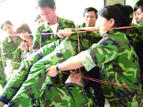 “相信大家,放心把你自己交給大家,你什么都不要想,大家會安全地把你接住”這是“信任背摔”項目的內(nèi)涵所在。項目形式是一個人站在4米高的位置,手被紅領巾綁住,然后在隊友“我們準備好了,我們支持你,我們愛你”中從高空倒下,你的隊友們會用手臂把你安全接住,讓你感受團隊戰(zhàn)友的臂膀與赤誠。