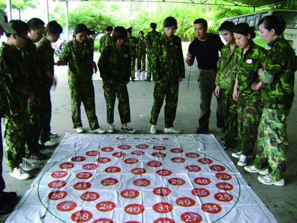 一張印有50個豪無規(guī)律數(shù)字的塑料毯,項目要求團隊在最快的時間里按1~50的順序踩數(shù)字,同時不能踩到毯子以及毯子上方不能同時出現(xiàn)兩只腳,否則要重新開始。在這項目中我們的“必勝莊園隊”認真思考,仔細研究塑料毯上看似無規(guī)律的數(shù)字其實也不是完全沒有規(guī)律的,上方的數(shù)字擺放比較稀疏,左右兩側和下方會相對密集。于是他們根據(jù)數(shù)字的規(guī)律調(diào)整人員分布,左右兩側和下方盡量多些人,大家手拉手互相扶持。果然,很有效率,輕輕松松地完成并以較短時間戰(zhàn)勝。而“勇者無敵隊”,由于沒有講究方法進行協(xié)條分工,是幾個人輪流踩數(shù)字,一直圍繞著毯子在跑與踩。幾輪下來,一個個滿頭大汗,也筋疲力盡,結果還是以戰(zhàn)敗告終。