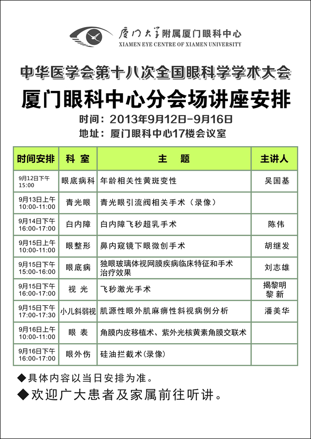 廈門眼科中心作為大會(huì)指定手術(shù)直播醫(yī)院,更是備受關(guān)注。學(xué)術(shù)大會(huì)期間,廈門眼科中心將作為分會(huì)場(chǎng),展開一系列講座。具體安排如下: