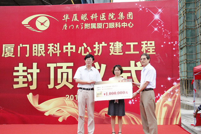 廈門眼科中心的封頂儀式在輕松的氣氛中開始,儀式簡單卻也頗具意義,主辦方將原本用于儀式的預算節(jié)約下來,并在現(xiàn)場捐贈給廈門市光明基金會。“這是廈門眼科中心也是華廈眼科醫(yī)院集團延續(xù)公益慈善傳統(tǒng)的實際行動。為了響應國家規(guī)定,我們在籌辦封頂儀式時堅決反對鋪張,并將原本預算聯(lián)合其他活動預算的節(jié)余部分共計100萬元捐入光明基金,用于貧困眼疾患者的手術費用補助??梢哉f,封頂儀式的舉辦標志著我們公益事業(yè)的再邁步。” 華廈眼科醫(yī)院集團業(yè)務院長侯家敏在采訪中對記者說。