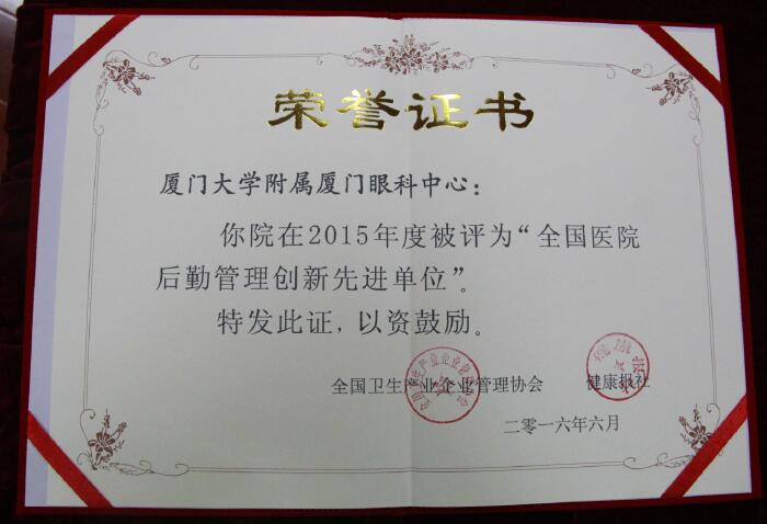 為積極配合醫(yī)藥衛(wèi)生體制改革,進(jìn)一步調(diào)動(dòng)醫(yī)院后勤改革與發(fā)展的積極性,推進(jìn)全國醫(yī)院后勤建設(shè)的全面提升和發(fā)展,在國家衛(wèi)生計(jì)生委醫(yī)療管理服務(wù)中心、國家衛(wèi)計(jì)委醫(yī)院管理研究所的指導(dǎo)組織下,全國衛(wèi)生產(chǎn)業(yè)企業(yè)管理協(xié)會(huì)與健康報(bào)社聯(lián)合開展了“2015年度全國醫(yī)院后勤管理創(chuàng)新先進(jìn)單位”評選活動(dòng)。經(jīng)過嚴(yán)格的初審、評審、公示、終審,廈門大學(xué)附屬廈門眼科中心獲此殊榮。我院在醫(yī)院后勤管理創(chuàng)新方面成效顯著,得到了衛(wèi)生相關(guān)部門的肯定與表彰。