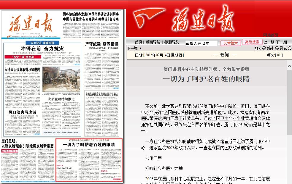 近日,福建日?qǐng)?bào)記者前往廈門眼科中心,對(duì)這家作為改制典范的醫(yī)院進(jìn)行了深入采訪。7月14日,福建日?qǐng)?bào)頭版刊登了報(bào)道,特別對(duì)廈門眼科中心改制以來的轉(zhuǎn)型升級(jí)、醫(yī)療服務(wù)和人才引進(jìn)等方面的創(chuàng)新舉措給予了高度的肯定。相關(guān)文章轉(zhuǎn)載如下: