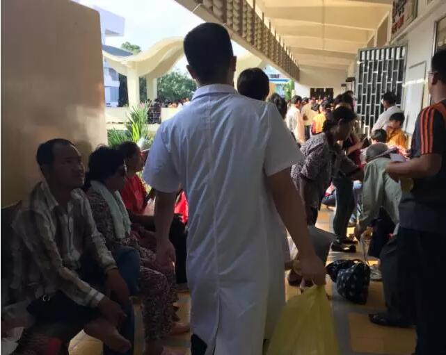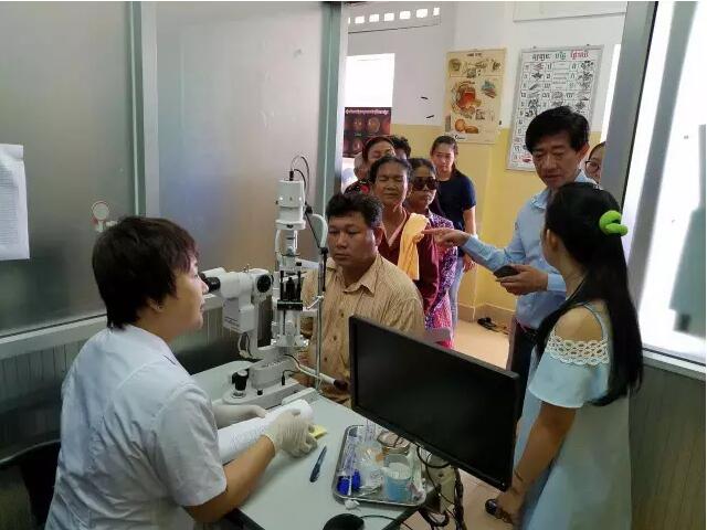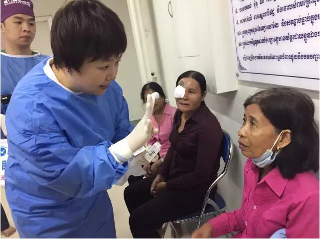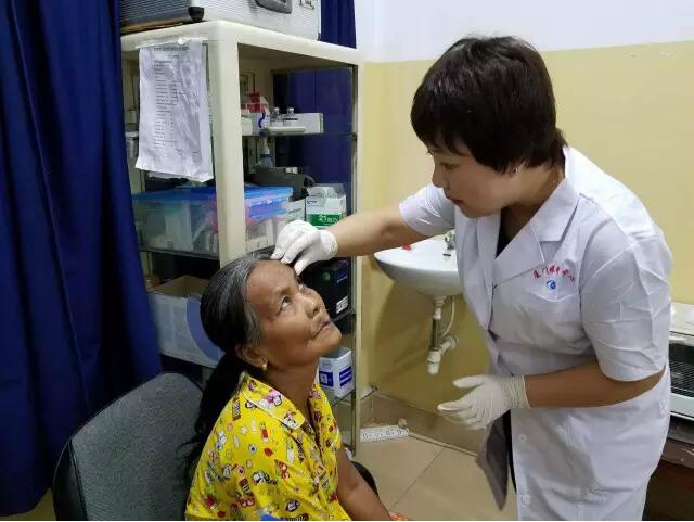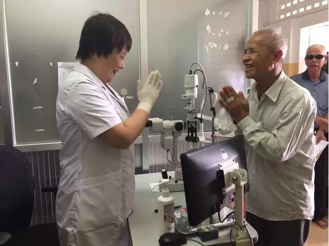 這個(gè)情況被手術(shù)結(jié)束出來取晶體的護(hù)士看到了,她報(bào)告給了醫(yī)療隊(duì)隊(duì)長(zhǎng)李立梅博士,李博士聽到后立刻走出手術(shù)室來到老人身旁,握起老人的手親切問到:“奶奶,你怎么了?是哪里不舒服嗎?”老人用弱小地聲音結(jié)結(jié)巴巴地回答了一堆柬語(yǔ),經(jīng)過翻譯翻譯后才知道,老人是因?yàn)楹ε率中g(shù)心里緊張,再加上手術(shù)室的冷氣才發(fā)抖的。