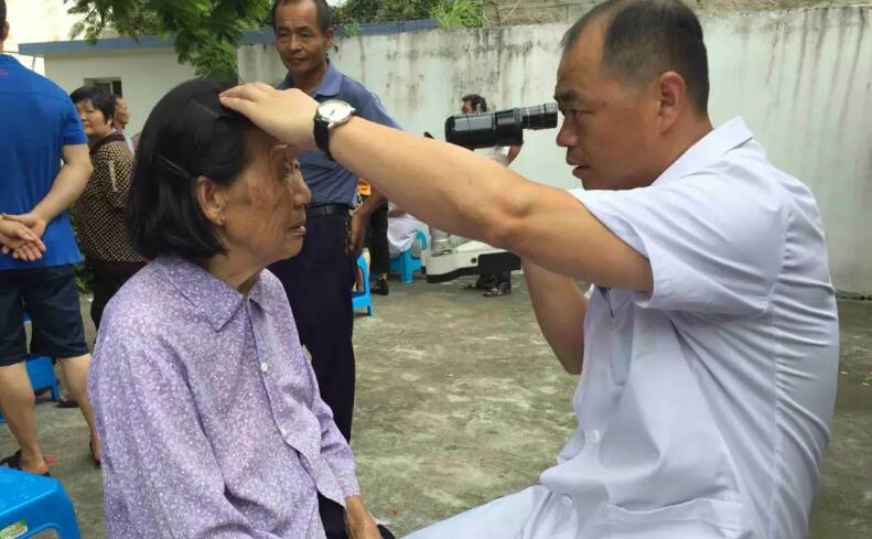 ▲廈門眼科中心陳偉主任為王阿婆檢查眼睛