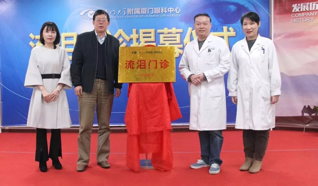 ▲廈門眼科中心業(yè)務(wù)院長侯家敏、眼整形??茖W(xué)科周太平主任、淚道疾病專家鄧?yán)っ?、?zhí)行總經(jīng)理姚鄭玲玲等為流淚門診揭牌