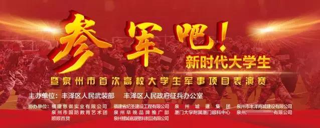 2019年5月25日,由泉州市豐澤區(qū)人民武裝部,豐澤區(qū)人民政府征兵辦公室主辦,廈門(mén)大學(xué)附屬?gòu)B門(mén)眼科中心協(xié)辦的《參軍吧!新時(shí)代大學(xué)生暨泉州市首次高校大學(xué)生軍事項(xiàng)目表演賽》在泉州市豐澤廣場(chǎng)舉行。表演賽吸引了泉州師范學(xué)院,泉州黎明職業(yè)大學(xué),福建電力職業(yè)技術(shù)學(xué)院,華僑大學(xué)等高校學(xué)生代表團(tuán),以及市民近千人,還有網(wǎng)絡(luò)、電視等130多家媒體通過(guò)現(xiàn)場(chǎng)直播或在線直播形式參加。