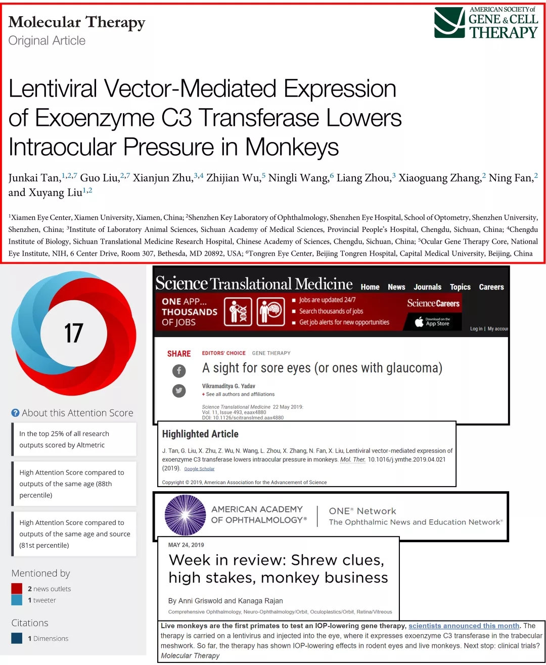 該項(xiàng)研究是以非人靈長(zhǎng)類動(dòng)物恒河猴為實(shí)驗(yàn)對(duì)象,應(yīng)用失活病毒作為載體,將有利于房水排出的基因?qū)牒镅坌×?主要房水排出通道),能引起長(zhǎng)達(dá)112天的眼壓下降,并且未見(jiàn)不良反應(yīng)。此前,成功地將功能基因?qū)牒镅坌×航M織并發(fā)揮降眼壓作用尚未見(jiàn)報(bào)道。隨即國(guó)際雜志《Science Translational Medicine》(影響因子18分)推薦了該篇研究論文,接著美國(guó)眼科學(xué)會(huì)(AAO)官方網(wǎng)站對(duì)其進(jìn)行了報(bào)道,兩者均認(rèn)為此項(xiàng)研究有較好的學(xué)術(shù)價(jià)值和臨床應(yīng)用前景。目前該篇文章的Altmetric評(píng)分(社會(huì)化影響力)為17。這是繼近年來(lái)年劉旭陽(yáng)教授團(tuán)隊(duì)在發(fā)表多篇系列研究論文(如去年的美國(guó)IOVS雜志)后的又一成果展示,標(biāo)志著該團(tuán)隊(duì)在青光眼基因治療方面的工作正在穩(wěn)步發(fā)展。目前該團(tuán)隊(duì)的相關(guān)工作仍在繼續(xù),比如用改進(jìn)的基因治療方法已經(jīng)降低猴眼壓達(dá)10個(gè)月以上,新的文章已經(jīng)投稿,并有望于今年發(fā)表。
