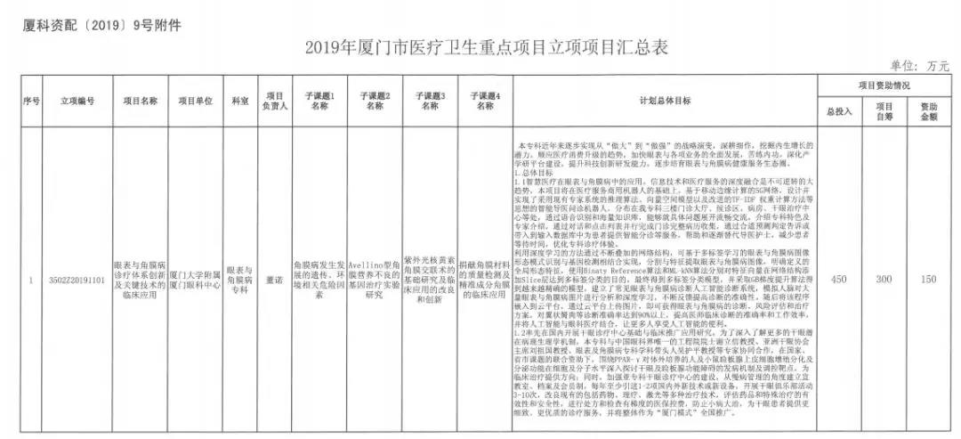 2019年廈門市醫(yī)療衛(wèi)生重點項目評選結(jié)果出爐啦!經(jīng)過層層嚴(yán)格評選、考核、調(diào)研廈門眼科中心眼表與角膜病??粕陥箜椖揩@批“市級醫(yī)療衛(wèi)生重點項目”同時獲撥資助基金150萬元項目,總投入450萬元!