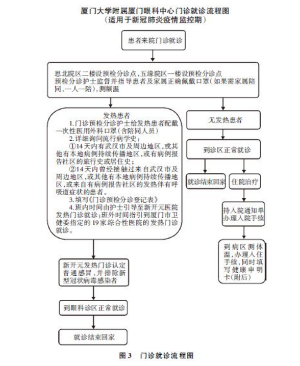 2019年12月以來新型冠狀病毒肺炎疫情迅速蔓延,面對(duì)這種傳染性極強(qiáng)的新冠病毒,眼科醫(yī)護(hù)人員應(yīng)該在救治眼科患者的同時(shí)做好醫(yī)患人員的防護(hù)。下面就廈門眼科中心根據(jù)衛(wèi)生健康委的要求(圖1,2)在疫情期間開診過程結(jié)合眼科的特點(diǎn)制定并不斷完善了這些流程,供眼科同道參考。
