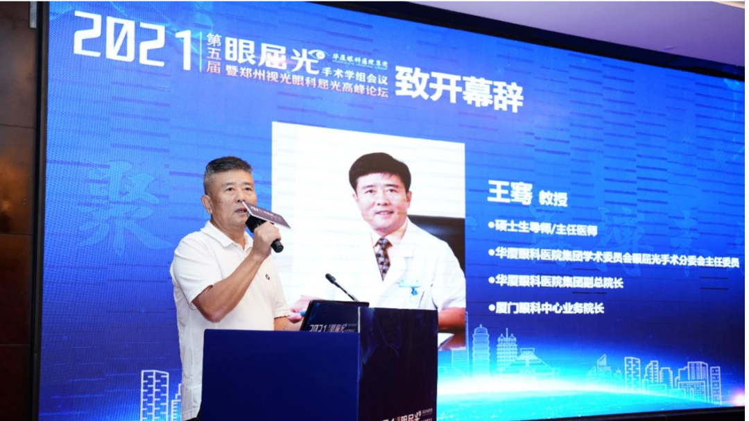 ▲集團學術委員會眼屈光學會分委會主任委員、廈門眼科中心業(yè)務院長王騫教授致開幕辭