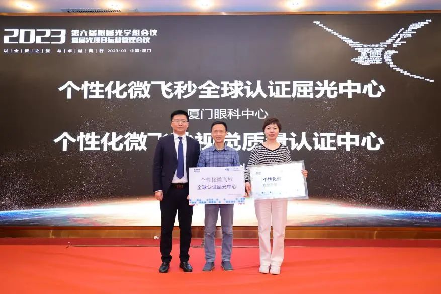 ▲ 蔡司醫(yī)療屈光大東區(qū)患教經(jīng)理吳婷婷女士、蔡司醫(yī)療福建區(qū)域銷(xiāo)售經(jīng)理顏斐嶸先生為廈門(mén)眼科中心頒發(fā)“全飛秒科普貢獻(xiàn)獎(jiǎng)”。