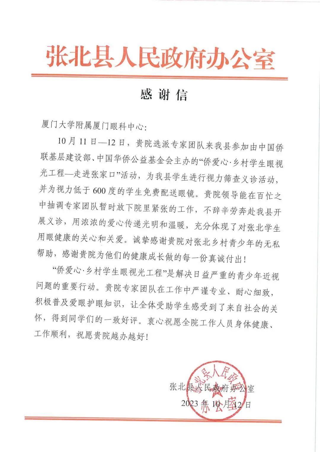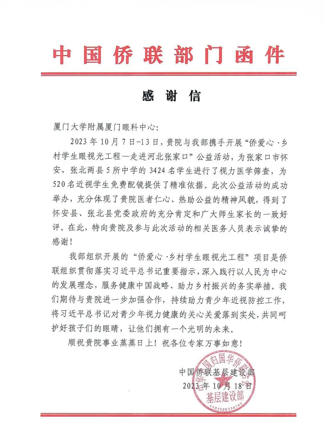 近日,廈門眼科中心接連收到來自中國僑聯(lián)基層建設部、懷安縣和張北縣人民政府辦公室的三封感謝信,信中對廈門眼科中心在“僑愛心·鄉(xiāng)村學生眼視光工程-走進河北張家口”公益活動中的無私付出及對鄉(xiāng)村孩子的寶貴的幫助給予充分認可與真摯感謝。