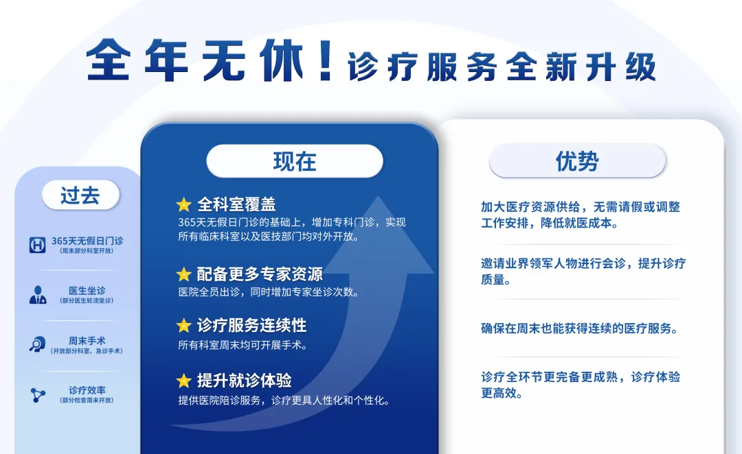 通過實(shí)施“無假日門診,診療再升級(jí),周末開通門診”的組合方案,醫(yī)院可以在時(shí)間和服務(wù)質(zhì)量上雙重提升,確?;颊咴谌魏螘r(shí)間都能獲得高質(zhì)量的醫(yī)療服務(wù)。這不僅提高了患者的就診體驗(yàn),也增強(qiáng)了醫(yī)院的整體競爭力和服務(wù)水平,真正實(shí)現(xiàn)就醫(yī)無障礙,看病無需再請(qǐng)假,周末也能看醫(yī)生!