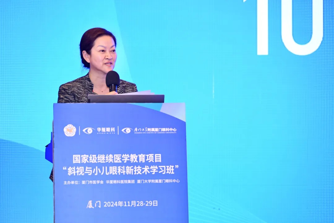 ▲ 廈門(mén)眼科中心業(yè)務(wù)副院長(zhǎng)、斜視與小兒眼科學(xué)科帶頭人潘美華教授主持開(kāi)幕式
