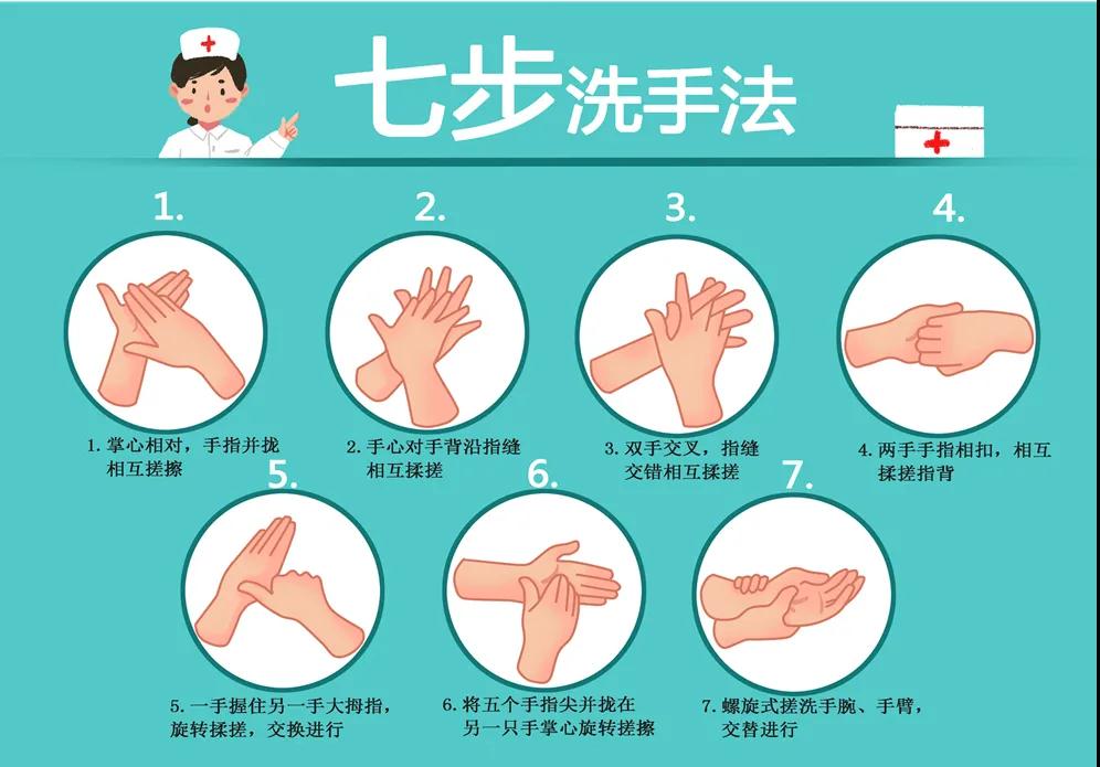 接觸外界環(huán)境后,要用流水和除菌洗手液按照七步洗手法嚴(yán)格洗手。
