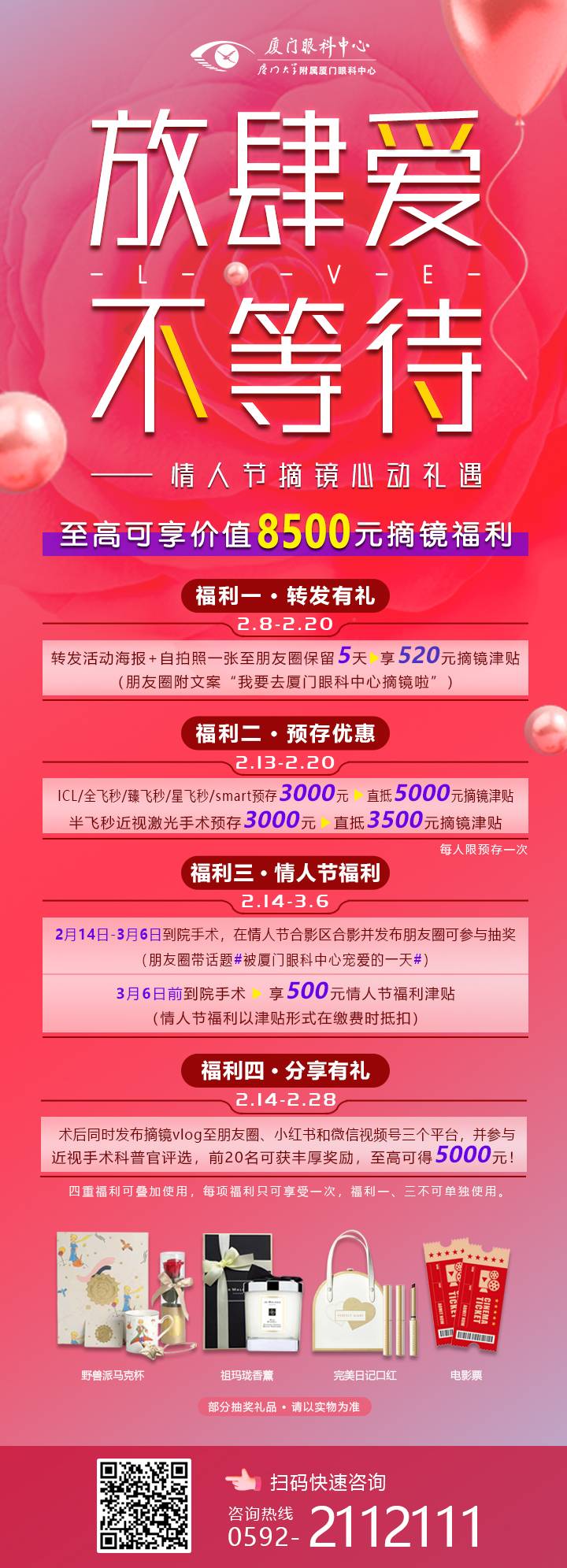 3月6日前到院手術(shù)可享500元到院紅包(到院紅包由津貼形式在繳費時抵扣)。2月14日-3月6日前到院手術(shù),在屈光中心情人節(jié)布景區(qū)合影并帶話題#被廈門眼科中心寵愛的一天#,發(fā)布至朋友圈即可參與抽獎。抽獎時間:2月14日-3月6日(現(xiàn)場抽獎每人限1次,人人皆可中獎。禮品包含祖瑪瓏香薰、野獸派杯子、完美日記口紅、電影票2張等。)