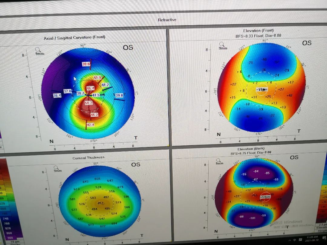 圓錐角膜早期病變表現(xiàn)為角膜表面異常隆起,角膜地形圖可以體現(xiàn)角膜表面形態(tài),它能夠精確測(cè)量分析全角膜表面任意點(diǎn)的曲率、厚度、形態(tài),及時(shí)發(fā)現(xiàn)角膜形態(tài)是否異常。