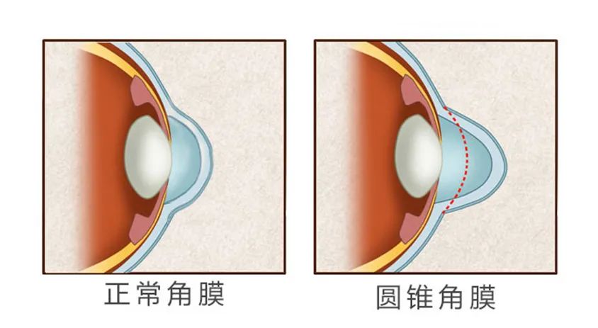 我們的眼睛從側(cè)面看上去,正常都是平緩的球形,圓錐角膜卻不是,圓錐角膜從側(cè)面看,更像一個(gè)凸起的椎體。由于角膜不斷前凸變薄,在這個(gè)過(guò)程中,角膜形態(tài)會(huì)不斷發(fā)生改變,就會(huì)造成近視和散光的加深,這也是圓錐角膜的主要癥狀。