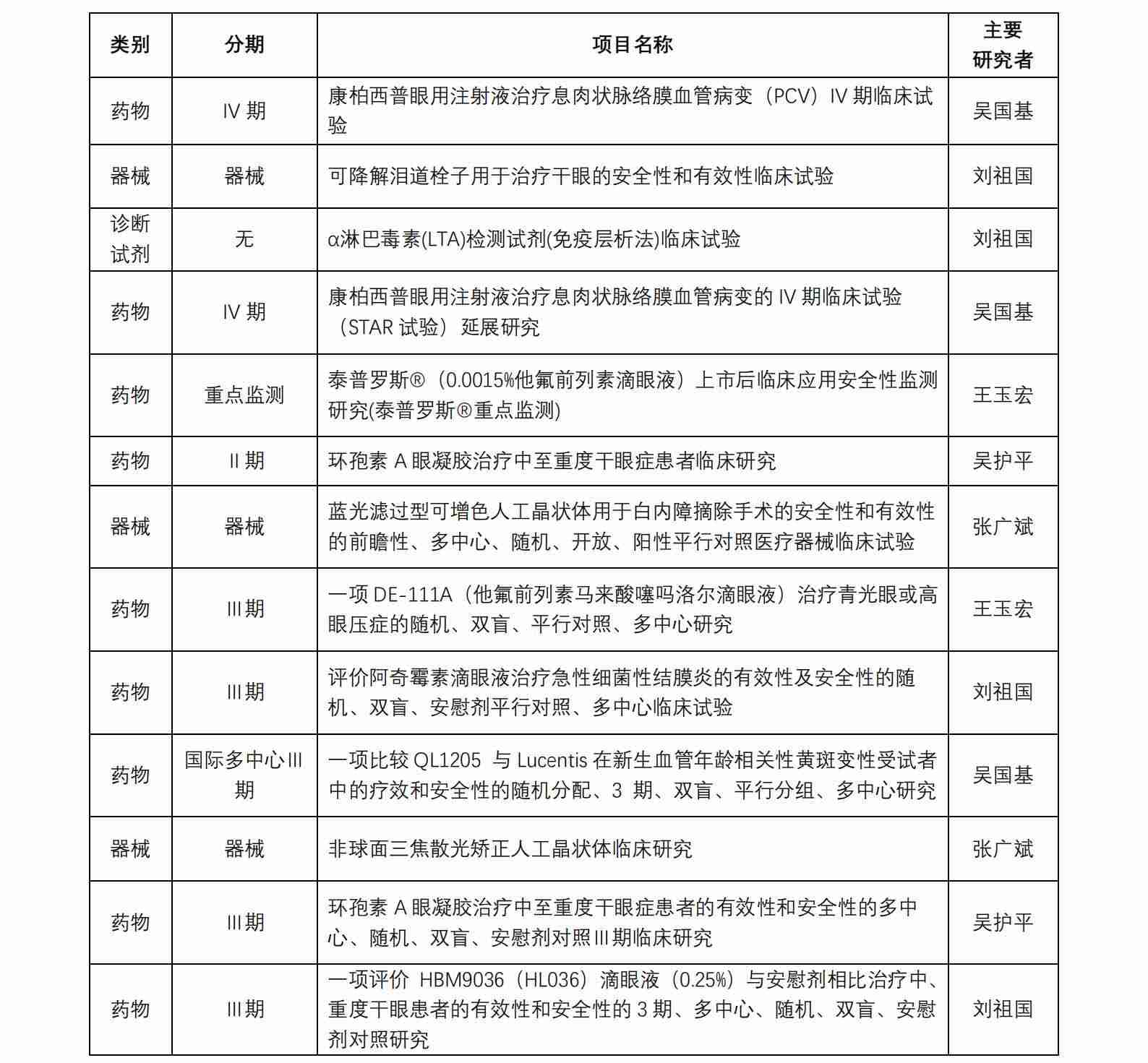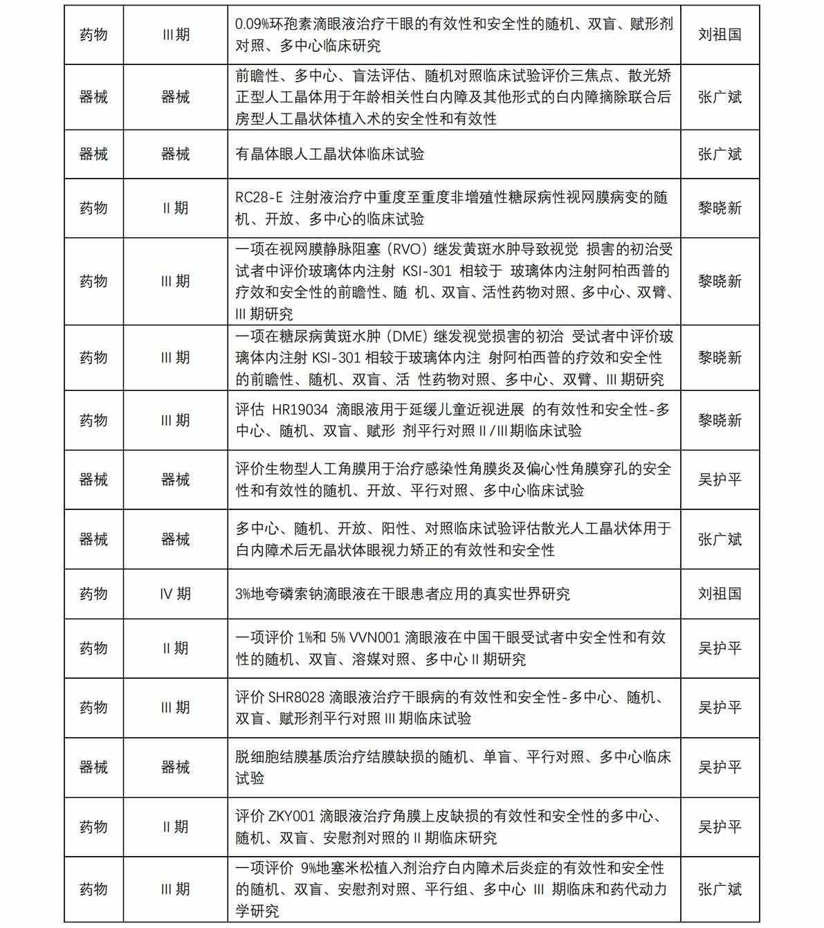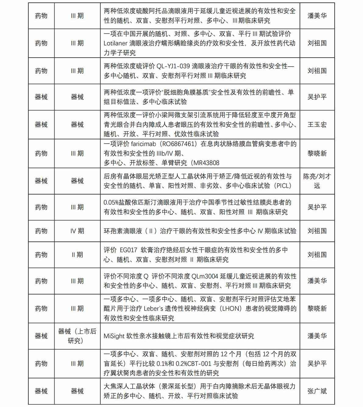 廈門大學(xué)附屬?gòu)B門眼科中心藥物臨床試驗(yàn)機(jī)構(gòu)(以下簡(jiǎn)稱“機(jī)構(gòu)”)于 2017 年獲得國(guó)家藥物臨床試驗(yàn)(眼科專業(yè))資格。機(jī)構(gòu)可承擔(dān)新藥Ⅱ、Ⅲ、Ⅳ期臨床試驗(yàn),也是承擔(dān)醫(yī)療器械、體外 診斷試劑的重要研究機(jī)構(gòu)。從獲批至今,機(jī)構(gòu)已承接臨床試驗(yàn)項(xiàng)目共計(jì) 45 項(xiàng)(包含藥物臨床試驗(yàn)項(xiàng)目 31 項(xiàng),器械臨床試驗(yàn)項(xiàng)目 13 項(xiàng) ,體外診斷試劑試驗(yàn)項(xiàng)目 1 項(xiàng)), 由本中心作為組長(zhǎng)單位牽頭的項(xiàng)目共計(jì) 8 項(xiàng)。